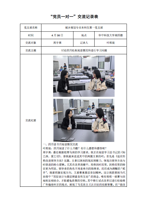 城乡规划专业本科生第一党支部叶雨琰与周宇茜就四月经典阅读情况和学习问题进行讨论。 |