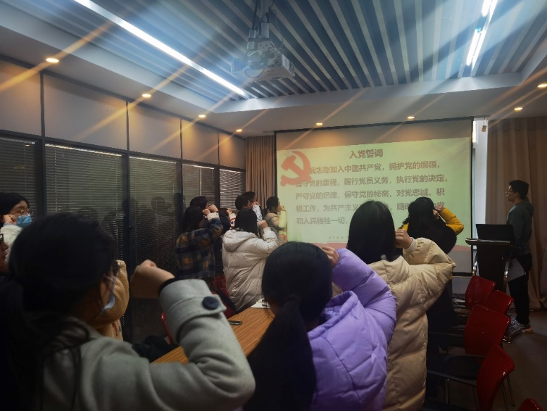 会议在雄壮的国歌声中开始。第一项,预备党员入党宣誓暨全体党员重温入党誓词。上个月经支部大会无记名投票表决,何杨杨、郑晴、余雷、易佳晨、韩叙、周梦笛同志成为预备党员,这是他们首次以党员身份参与支部大会。为了进一步加强支部归属感,端正入党动机、增强党性修养,在党支书的领誓下,六位预备党员站在台前和其他与会党员一起重温入党誓词,增进为党的事业奋斗终身的决心。