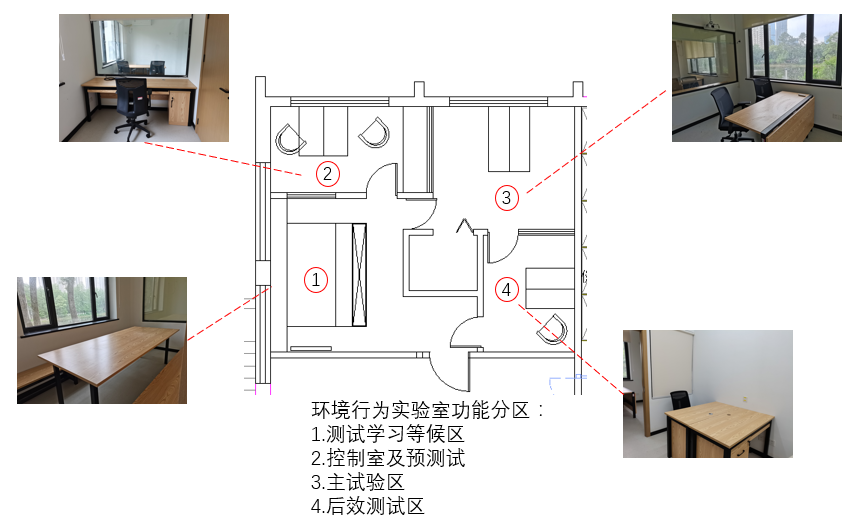 环境行为实验室为支撑《环境-行为研究概论》及相关学科人因类教学实验需求而设,实验室位于南四楼N107“健康与智慧人居环境全过程设计实验平台”D区,由前测试区、控制区、实验区及后测试区四个部分组成,建筑面积45平方米。环境行为实验室目前可以支撑基于眼动追踪技术、多导生理测试技术等的建筑环境人因教学实验。