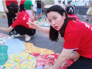 7月18日下午,华中大公司党员先锋服务队小河分队在驻地前的小广场开展“爱‘拼’才会赢”拼布活动。活动以古街特有的文化底蕴为基础,对古街乡民熟知的日常街景做出艺术性的阐释,并以公众参与为理念,公众美育普及为目的,引导乡民关注美、感受美、表现美、创造美,营造人人都爱小河、装饰小河、点亮小河的氛围,为古街增阴凉、添色彩。