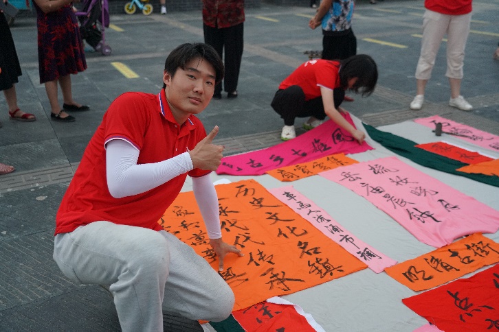 “岳庙晨钟、石桥晚眺、菜圃连村”。古街的居民纷纷亮出拿手技艺,用毛笔在纯色布上写下他们的古街印象。“还有没有布?让我也来写几句。”一位大爷向队员询问。书法拼布制作完成后,拼布上的书法作品将飘扬在小河古街上,书香气息将更加融入乡民的交往空间。