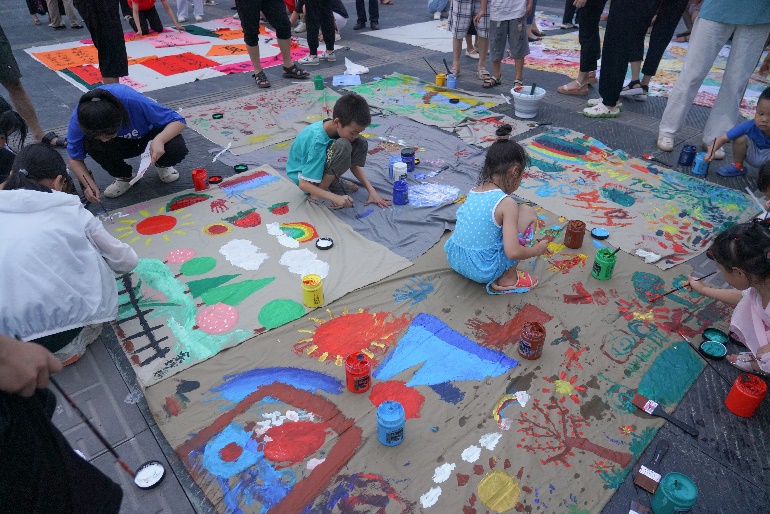 “下次有这种活动我还要来玩!”孩童响亮的稚声落在广场上。拼布上,孩子们拿着画笔,蘸上颜料,随性绘色。一片沙滩、一棵小树、一朵白云、几个手掌印,孩子们用五彩缤纷的色彩描绘着童年里小河古街最美的夏天。“你们这样的活动很有创意,也很接地气,孩子们都很喜欢,是一种很好的美育形式。”一位孩子家长在活动现场感慨道。