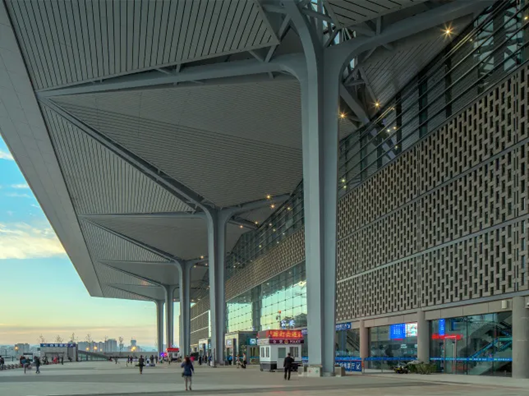 杭州东站是国内最早实践TOD站城融合理念的交通枢纽之一,建筑形式清晰表达结构逻辑,体现面向未来的时代精神。项目采用“异型钢斜柱+大跨度变截面钢桁架”新型结构体系,实现了无缝复杂双曲面表皮以及建筑光伏一体化等技术应用。