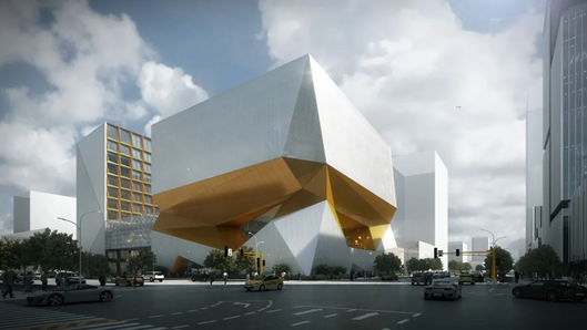 整个电竞中心项目以“光之谷,晶之城”为主题,提出“活力之源、能量之塔、电竞之晶、乐玩之城”四大主题亮点,以电竞馆为核心,打造场馆——产业一体化的活力聚落。电竞主场馆以连续折面隐喻电竞能量水晶与链接网络,寓示光谷产业基地以“电竞水晶”为核心,不断迸发新的能量链接世界、链接未来。