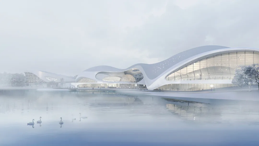 音乐厅造型以“喻家山水”与“跳动音符”构成抽象化的设计元素,建筑在灵动的曲线中自发生长,通过流畅的建筑体量表达独特的艺术气质。