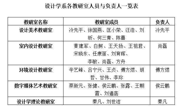 公司艺术设计专业下设设计美术、室内设计、环境设计、数字媒体艺术、设计学理论等5个教研室。各教研室人员与负责人安排如下: